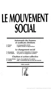 Varia n°165, 1993/4 - pagesPages 3 à 6Syndicalisme au fémininPar Françoise ThépaudPages 7 à 22Les syndicats féminins chrétiens et la formation militante de 1913 à 1936: "propagandistes idéales" et "héroïne identitielle"Par Joceline ChabotPages 23 à 42L'apôtre sociale et l'ange du foyer: les femmes et la C.F.T.C. à travers Le Nord-Social (1920-1936)Par Christine BardPages 43 à 66Le développement de l'électrométallurgie en Maurienne: recomposition et nouvelles régulations d'un milieu rural en crise (1897-1921)Par Nicolas BourguinatPages 67 à 86Vie privée et engagement dans une organisation syndicale: une tentative d'approche quantitative de populations d'adhérents et de militants aux ateliers de réparations ferroviaires d'OullinsPar Christian ChevandierPages 87 à 102Les étapes syndicales des E.T.A.M. de la mine des origines à nos joursPar Diana Cooper-RichetPages 103 à 128L'émergence d'un système de conventions collectives dans le secteur charbonnier en Inde: un avènement résistible?Par Gérard HeuzéPages 129 à 160Notes de lecture