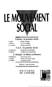 Varia n°172, 1995/3 - pagesPages 3 à 5Par le cinéma ou vers le cinémaPar Pierre SorlinPages 6 à 6Le cinéma dans Le Mouvement SocialPages 7 à 201895. Les images, les foules et le cinémaPar Shlomo SandPages 21 à 38"Le contrepoison est entre vos mains, camarades". C.G.T. et cinéma au début du sièclePar Tangui PerronPages 39 à 50Histoire et cinéma. Une relation à plusieurs étagesPar Jean-Louis LeutratPages 51 à 52Nouvelles perspectives sur Victor GriffuelhesPar Bruce VandervortPages 53 à 88Les finances, une approche des problèmes de structure et d'orientation de la C.G.T. (1895-1914)Par Michel PigenetPages 89 à 94Pour un dialogue avec Annie Kriegel et son oeuvrePar Madeleine RebériouxPages 95 à 99Thorez, le P.C.F. et la nationPar Annie KriegelPages 100 à 100Annie Kriegel dans Le Mouvement SocialPages 101 à 1081921: la scission fondatrice?Par Jean-Louis RobertPages 109 à 159Notes de lecture